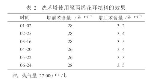 山西古縣一焦化廠 3 600mm× 3 000mm洗苯塔使用的是聚丙烯花環(huán)填料,裝填填料163m 3,配套600kt/a焦化項目,填料總造價26.08萬元。自2004年12月投產至今,經多次蒸汽吹掃后花環(huán)填料層明顯下沉,塔后含苯較投產初期高。 2009年洗苯塔前、后苯含量如表2