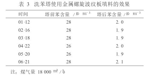 山西古縣錦華焦化廠 2 800mm× 3 000mm洗苯塔采用的是金屬螺旋波紋板填料,裝填填料99m 3,配套400kt/a焦化項目,填料總造價59.40萬元。自2005年投產至今,使用效果尚可,其主要缺陷在于填料造價太高。 2009年洗苯塔前、后苯含量如表3。